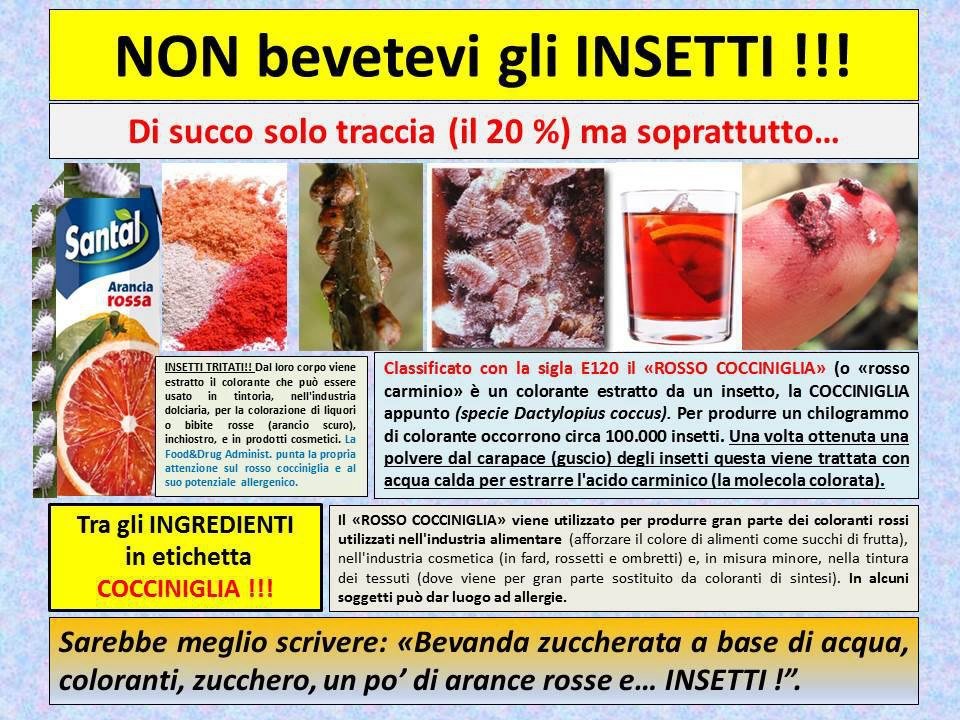 Bibite con insetti. Alcuni coloranti naturali sono ottenuti dagli insetti, i chimici sono invece causa di gravi malattie. Cosa scegliere?