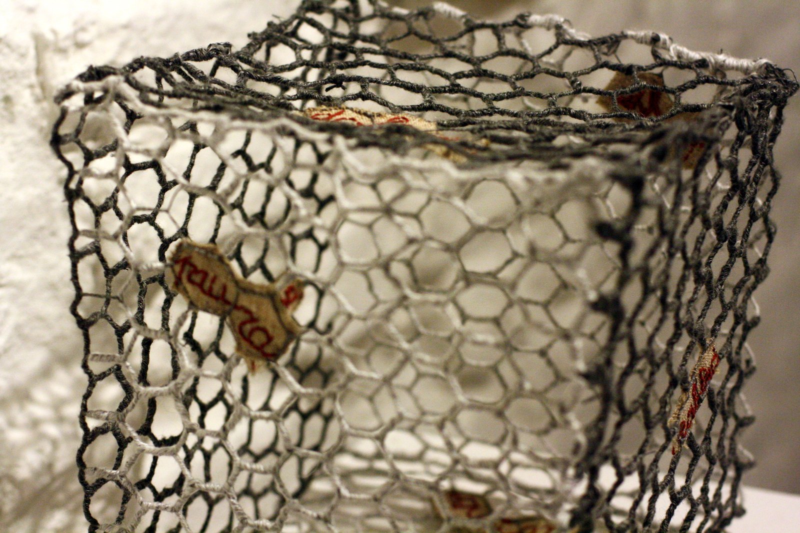 In questa esposizione l’artista ha lavorato con materiali preziosi: biancheria ricamata, rammendi antichi, iniziali, cifre, pizzi e sete fornitele dalla collezionista Luciana Pramotton.