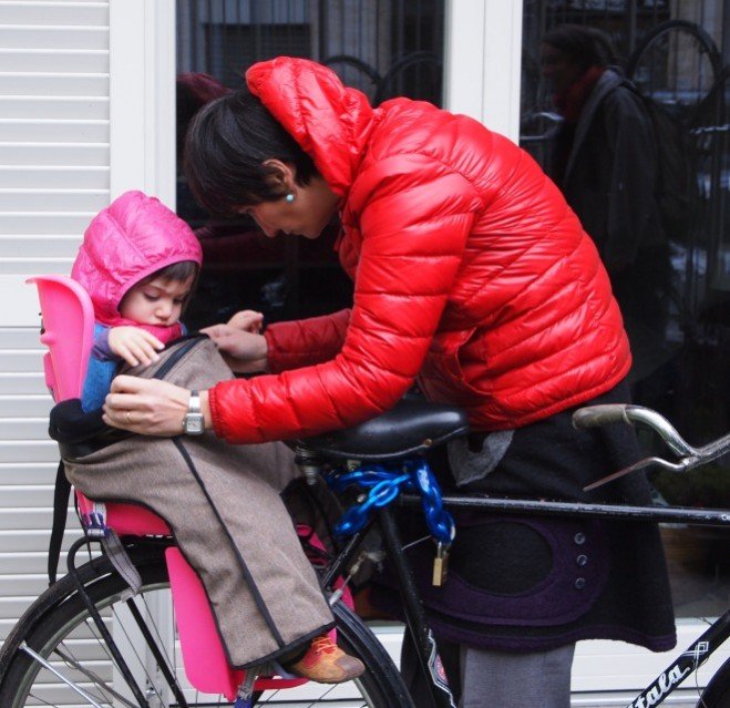 Messi in atto questi semplici accorgimenti si comprende come l’inverno non possa rappresentare un problema per i ciclisti. Si tratta solo di un’altra stagione per lo spostamento sulle due ruote. Il problema, se esiste un problema, è legato ai bambini a bordo che svolgono un ruolo passivo in fase di viaggio. In famiglia abbiamo sempre portato le nostre bimbe in bici, anche in tenera età e tutto l’anno. Ovviamente i baby passeggeri vanno salvaguardati dal freddo in modo più che adeguato. In commercio esistono alcuni accessori atti a mitigare il freddo e dare riparo ai più piccoli. Per percorsi urbani brevi per il seggiolino anteriore ci bastava utilizzare il parabrezza montato al manubrio. La bimba seduta dietro non prendeva aria grazie al genitore in sella che faceva da scudo. Nei periodi più freddi all’abbigliamento invernale aggiungevamo le copertine. Recentemente negli ultimi anni il mercato si è adeguato a genitori più esigenti che sono alla ricerca di soluzioni pratiche e intelligenti.