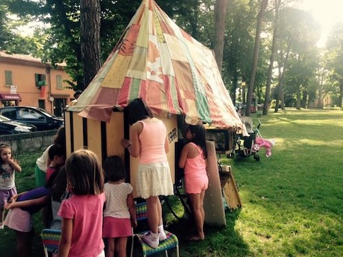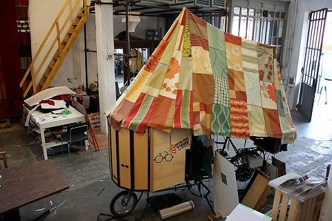 Una bici-teatro, non sapremmo come altro definirla, un mezzo insolito a due ruote interamente autocostruito con materiale di recupero, comprese marionette e scenografie. Come potete vedere dalle immagini, se non avete ancora avuto la fortuna di incontrarla, è una bicicletta da carico perchè porta con sé tutto l’occorrente per fare spettacolo.
