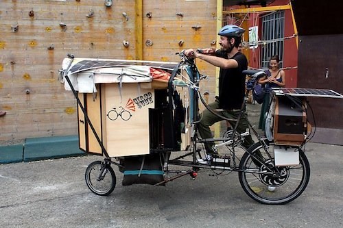 Il mio mezzo di lavoro è lungo 3metri, largo 1,30 metri, è alto 1,60, pesa 95 chilogrammi. In fase di progettazione mi sono attenuto ai limiti di legge. Ci tengo a precisare che si tratta di una bici sostenibile, a impatto zero per l’ambiente. È ecologica perchè è stata costruita interamente con materiale di recupero e a livello energetico è totalmente autosufficiente, in quanto dotata di un pannello solare che attiva la pedalata assistita e l’intero l’impianto elettrico e di amplificazione.