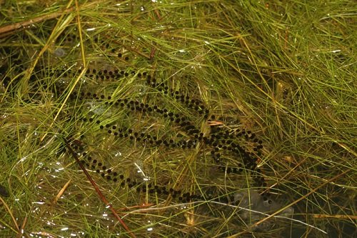 Per diversi giorni la coppia ha soggiornato tra le acque dello stagno per poi scomparire lasciandosi alle spalle una consistente quantità di uova ben ancorate e intrecciate tra le foglie dell’iris.