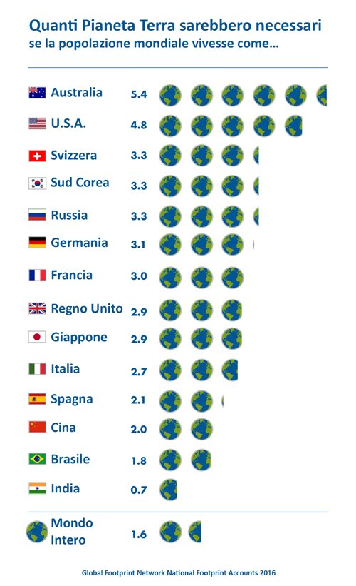 Per quel che riguarda il Bel Paese, invece, se la popolazione mondiale vivesse e consumasse al ritmo di noi Italiani servirebbero 2,7 Pianeti, mentre per soddisfare la domanda italiana di risorse sarebbero necessarie 4,3 “Italie”. Certo, sempre meglio degli Svizzeri, che avrebbero bisogno di 3,3 pianeti e di 4,4 Svizzere, ma potremmo comunque impegnarci di più. Come?