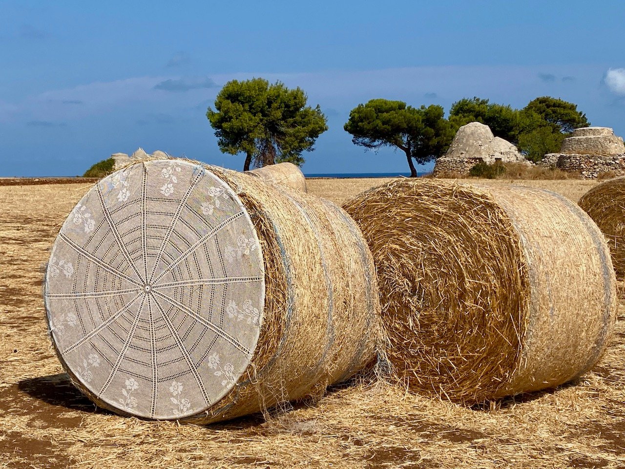 L’idea non è nuova e gli stessi ideatori dichiarano di essersi ispirati ad analoghe opere realizzate lo scorso anno in Puglia, nei pressi di Locorotondo. Anche qui alcuni centrini all’uncinetto, tutti di colore bianco, decoravano svariate rotoballe nei campi affacciati sul mare, sparse in mezzo ai trulli.