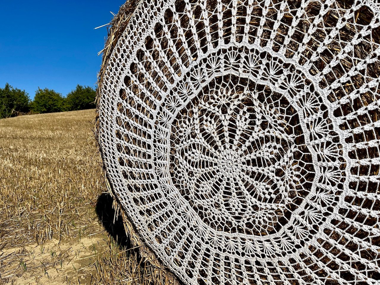 Centrini all’uncinetto per decorare le balle di fieno e celebrare la natura e il lavoro della terra. A metà tra la landscape art e lo yarn bombing, per tutti gli amanti delle installazioni insolite e che valorizzano il paesaggio e i territori quest’anno è assolutamente d’obbligo far tappa in Piemonte.