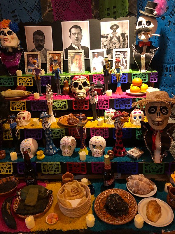 Innanzitutto, l’elemento centrale dei festeggiamenti è l’altare, o altar de muertos oppure ancora Ofrenda, dove vengono disposte fotografie dei defunti, candele, offerte e i tipici Chempasùchil, fiori messicani dalle sfumature gialle e arancioni, i cui petali vengono sparsi un po’ ovunque, sia per le strade che per i cimiteri, per fare in modo che le anime trovino la via di casa.